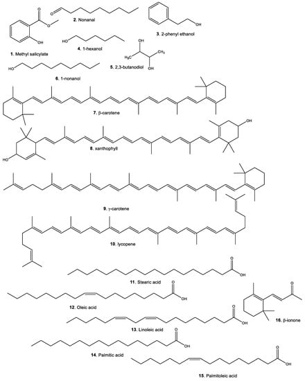 | 16 | β-ionone | x | Raw pulp | ETHOS; HS-SPME/GC-MS | [85] | |