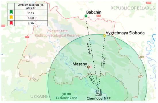 Map of the experimental plots (Babchin, Vygrebnaya Sloboda, and Masany) located in the Polesye State Radiation-Ecological Reserve (Khoiniki, Gomel Region, Republic of Belarus) where A. thaliana Bab-0, VS-0, and Masa-0 natural accessions, respectively, were collected. The dose rates are represented in Table 1. The map was created using Google Maps (Google LLC, Mountain View, CA, USA), and adapted with Microsoft PowerPoint 2019 (Microsoft Corporation, Albuquerque, NM, USA).