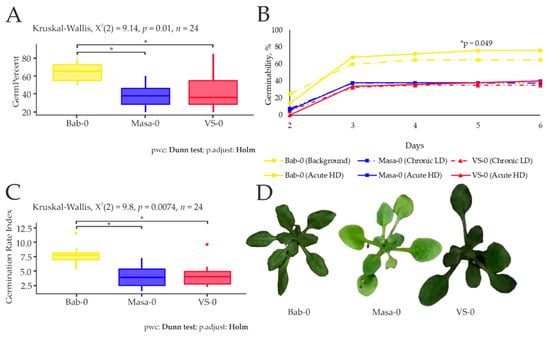 (A). Germinability, %, of seeds collected from the Babchin (Bab-0), Masany (Masa-0), Vygrebnaya Sloboda (VS-0) plots. (B). Germinability (%, at days 2–6 after seed transfer to the growth chamber. Bab-0 (Background), Masa-0 (Chronic LD) and VS-0 (Chronic LD)—seeds collected from the experimental plots Babchin, Masany, and Vygrebnaya Sloboda, respectively; Bab-0 (Acute HD), Masa-0 (Acute HD) and VS-0 (Acute HD)—seeds collected from the experimental plots and exposed to acute γ-irradiation at a dose of 150 Gy. (C). Germination Rate Index, seed × days−1, of seeds collected from Babchin (plot with background radiation level) and radioactively contaminated plots Masany and Vygrebnaya Sloboda. (D). A. thaliana plants from the experimental plots. The graphs were created using RStudio v1.4 (R-Tools Technology, Richmond Hill, ON, Canada). Data are presented for two independent experiments with four biological replicates in each (20 seeds per replicate for each accession). *—significant differences at p < 0.05 ((A,C)—Kruskal–Wallis test with Dunn’s test using the Holm–Bonferroni correction for multiplicity; (B)—irradiated compared to control, Mann–Whitney U-test).