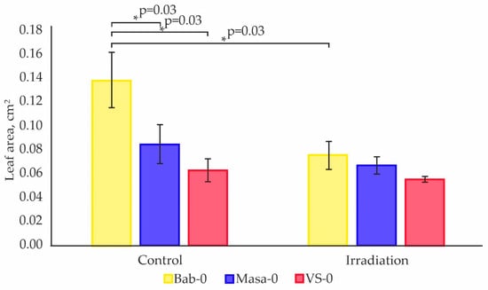 Mean leaf area of one plant (cm2) measured on the 11th day of cultivation for four biological replicates (up to 20 plants per replicate). “Control” represents plants from untreated seeds of accessions Bab-0 (Background), Masa-0 (Chronic LD), VS-0 (Chronic LD). “Irradiation“ represents plants grown from seeds exposed to acute γ-irradiation at a dose of 150 Gy (Acute HD). Significant difference with exact p-values (Mann–Whitney U-test) are denoted by asterisk. The graphs were created using RStudio v1.4 (R-Tools Technology, Richmond Hill, ON, Canada).