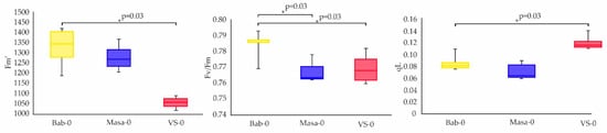 Parameters of photosynthetic activity of 17-day-old plants, grown from untreated seeds of accessions Bab-0 (Background), Masa-0 (Chronic LD), VS-0 (Chronic LD). Fluorescence was measured on the 17th day of cultivation in three plants per replicate for three biological replicates. Significant differences with exact p-values (Mann–Whitney U-test) are denoted by asterisk. The graphs were created using RStudio v1.4 (R-Tools Technology, Richmond Hill, ON, Canada).