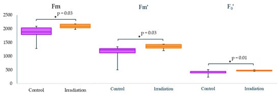Chlorophyll fluorescence of juvenile Bab-0 plants, measured on the 17th day of cultivation in three plants per replicate for three biological replicates. “Control”—plants grown from untreated Bab-0 (Background) seeds; “Irradiation”—plants grown from seeds exposed to acute γ-radiation at a dose of 150 Gy, Bab-0 (Acute HD). Significant differences with exact p-values (Mann–Whitney U-test) are denoted by asterisk. The graphs were created using RStudio v1.4 (R-Tools Technology, Richmond Hill, ON, Canada).