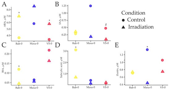 Median values of concentrations of five phytohormones (ABA—abscisic acid (A); IAA—indole-3-acetic acid (B); IBA—indole-3-butyric acid (C); salicylic acid (D); zeatin (E)) measured on 17th day in plants grown from seeds of Bab-0, VS-0, and Masa-0 accessions. Dots—control plants grown from seeds collected from the experimental plots with background or low-dose chronic irradiation and not exposed to acute γ-irradiation; triangles—plants grown from seeds exposed to acute γ-irradiation at a dose of 150 Gy. Phytohormones were measured in two technical replicates of 2–4 biological replicates composed by a pool of 10 plants each. Significant differences (Mann–Whitney U-test) between non-treated and acutely irradiated plants are denoted by * p < 0.050; # p = 0.052. The graphs were created using RStudio v1.4 (R-Tools Technology, Richmond Hill, ON, Canada).
