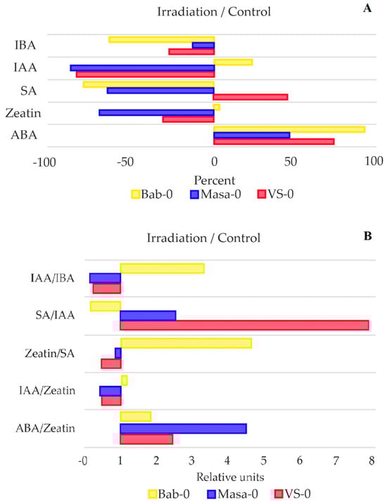 (A)—Percentage change in phytohormonal content of acutely irradiated plants to control samples (background Bab-0, chronically irradiated VS-0 and Masa-0). Values <0 denote a decrease in the phytohormone concentration, and >0 show an increase as a result of acute γ-irradiation at a dose of 150 Gy. (B)—Phytohormonal ratios of acutely irradiated samples to the same ratio of control samples (background Bab-0 and chronically irradiated VS-0 and Masa-0). Values <1 denote a decrease in the phytohormonal ratio as a result of acute γ-irradiation at a dose of 150 Gy, and values >1 show an increase. IBA—indole-3-butyric acid, IAA—indole-3-acetic acid, SA—salicylic acid, ABA—abscisic acid. The graphs were created using RStudio v1.4 (R-Tools Technology, Richmond Hill, ON, Canada).
