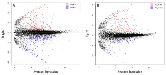 Overview of differential gene expression of 13-day-old A. thaliana seedlings recovering from chronic radiation exposure ((A). VS-0, and (B). Masa-0) in comparison to the background reference accession Bab-0. Log2FC—logarithm of gene expression fold change. All plants were grown under control conditions, pooled leaf sample from a Petri dish was used as a biological replicate. Two replicates per condition were used for RNA sequencing. The graphs were created using the edgeR Package for RStudio v1.4 (R-Tools Technology, Richmond Hill, ON, Canada). Graphical changes were made with Microsoft PowerPoint 2019 (Microsoft Corporation, Albuquerque, NM, USA).