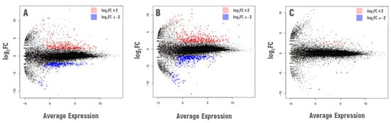 Overview of differential gene expression for additionally irradiated seedlings of A. thaliana selected from three experimental plots ((A)—Bab-0, (B)—VS-0, (C)—Masa-0) in comparison with the same accessions without acute irradiation. Log2FC—logarithm of gene expression fold change. The graphs were created using the edgeR Package for RStudio v1.4 (R-Tools Technology, Richmond Hill, ON, Canada). Graphical changes were made with Microsoft PowerPoint 2019 (Microsoft Corporation, Albuquerque, NM, USA).