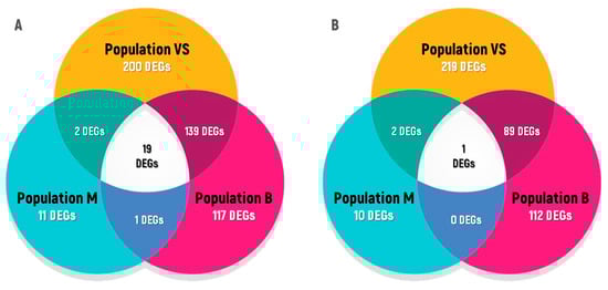 Unique and common responses to acute irradiation of seeds (150 Gy) for seedlings of A. thaliana from the CEZ. (A)—upregulated genes; (B)—downregulated genes. The graph was created using the Microsoft PowerPoint 2019 (Microsoft Corporation, Albuquerque, NM, USA).