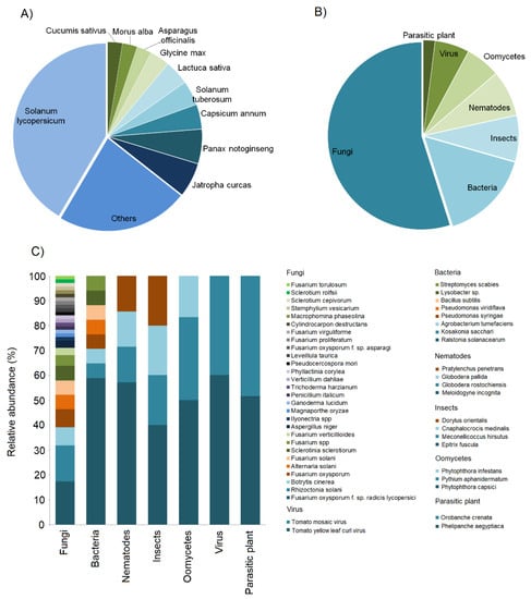 In 117 case studies reviewed, we observed that most of them (41%) were based on Solanum lycopersicum, followed by Jatropha curcas (6%) and Panax notoginseng (6%), Capsicum annum (4%), Solanum tuberosum (4%) and Lactuca sativa (4%), Cucumis sativus (3%), Morus alba (3%), Asparagus officinalis (3%), and Glycine max (3%). Finally, the remaining 23% of cases were based on other species, e.g., Lolium perenne, Malus commuins, Cucumis melo, Manihot esculenta, Phaseolus vulgaris, Daucus carot, Allium cepa, Oryza sativa, Zea mays, Radix pseudostellariae, Fragaria sp., Lepidium sativu, Solanum melongena, Nicotiana tabacum, Brassica rapa, and Lupinus angustifolius (Figure 1A, Table S1). Overall, we found that 55% of the case studies concerned pathogenic fungi, 15% bacteria, 8% insects, 8% nematodes, 6% oomycetes, 6% viruses, and 2% parasitic plants (Figure 1B, Table S2). The most studied species among the fungi was Fusarium oxysporum f. sp. radicis lycopersici, followed by Rhizoctonia solani, Botrytis cinerea, Fusarium oxysporum, Alternaria solani, Fusarium solani, Sclerotinia sclerotiorum, and Fusarium spp. (Figure 1C). Ralstonia solanacearum was the most investigated species among the bacteria; for nematodes, insects, oomycetes, and viruses, the most studied species were Meloidogyne incognita, Epitrix fuscula, Phytophtora capisci, and Tomato yellow leaf curl virus, respectively. Finally, for parasitic plants, both Phelipanche aegyptiaca and Orobanche crenata were investigated (Figure 1C, Table S3).