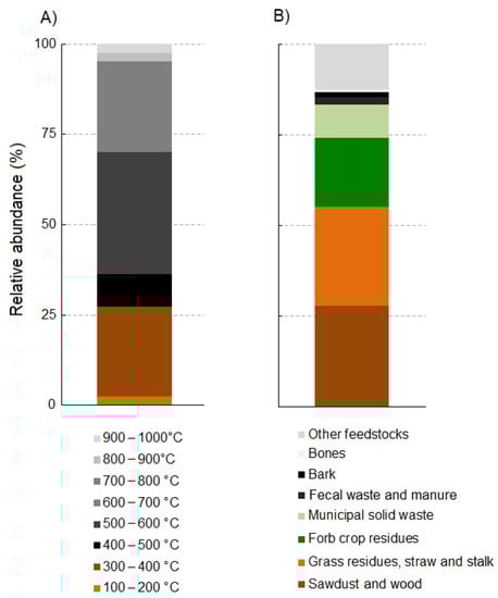 Concerning the pyrolysis process, the most used pyrolysis temperature range among our examined study cases was between 500 °C and 600 °C, followed by 300–400 °C and 600–700 °C (Figure 2A). Finally, regarding feedstock types used in the collected research articles, the most used were sawdust and wood residues, followed by grass residues (straw and stalk) and forb crop residues (Figure 2B).