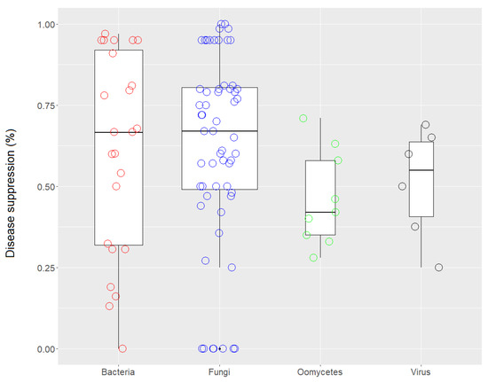 Jitter box plots of the disease-suppression rate against bacterial, fungal, oomycete, and viral pathogens. The lower and upper bounds of the boxplots show the first and third quartiles (the 25th and 75th percentiles); the middle line shows the median; whiskers above and below the boxplot indicate the interquartile range.
