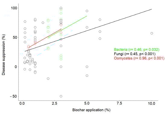 Based on correlation analysis, our results show that there is a strong positive correlation between disease-suppression rate and biochar application rate for the most studied microbial domains, i.e., fungi (r = 0.45, p < 0.001), bacteria (r = 0.46, p = 0.032), and oomycetes (r = 0.96, p < 0.001) (Figure 4). Moreover, our results show that the range of biochar application in the 117 case studies examined was from 1% to 10% for fungi, from 2% to 5% for bacteria, from 1% to 3% for oomycetes, from 1% to 5% for nematodes, from 1% to 3% for viruses, and from 1% to 20% for insects. In most case studies, the application range was between 1% and 3%. Regardless of application rate, the results showed varying responses to disease suppression, ranging from −50% to 100%, suggesting that pathogen response to biochar depends on a combination of several factors and not just on application rate, as we found a high variability of disease suppression among studies that used similar application rates.
