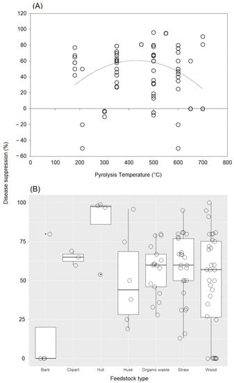 Our analysis of the link between disease-suppression rate and pyrolysis temperature showed a unimodal relationship (Figure 5A). The most commonly used temperatures ranged from 350 °C to 600 °C. The application of biochar produced at a temperature between 350 °C and 600 °C showed the most positive effect on disease suppression, although a high variability was found among case studies. When biochar was produced at lower or higher temperatures, some negative effects were observed regarding disease suppression. On the other hand, our results showed that the most common raw material used in the case studies, wood residues, affected disease control very differently, with both very low and high suppression efficacies observed (Figure 5B). Straw and husks also strongly affected disease suppression, with no negative effect observed. In the case of raw hull materials, cases were observed in which disease control was only positive. Finally, two cases with no effect and one case with a positive response in terms of disease control were observed for raw bark materials.