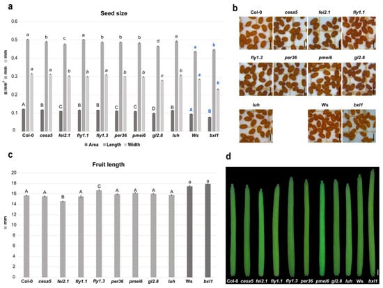 Effects of the cell wall mutations in seed and silique development. (a) Histogram representing seed size of the cell wall mutants, with mean of the seed area (mm2), length (mm), and width (mm); Error bars indicate the standard error (SE) of one representative biological replicate of n = 50 seeds. Statistical analyses were performed using ANOVA, followed by Tukey’s HSD test. Different letters indicate statistically significant differences (p < 0.01) (WT versus the other genotypes). (b) Stereomicroscope images of seeds from the cell wall mutants. Scale bar = 0.5 mm. (c) Histogram representing the mean of the silique length of the cell wall mutants; error bars indicate the SE of one representative biological replicate of n = 10 siliques. Statistical analyses were performed using ANOVA followed by Tukey’s HSD test; different letters indicate statistically significant differences (p < 0.01) (WT versus the other genotypes). (d) Stereomicroscope images of the siliques from cell wall mutants. Scale bar = 1 mm.
