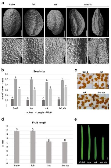 The luh stk double mutant seeds displayed an intermediate length phenotype between the stk and luh mutants (shorter than luh, longer than stk), but a clear increase in width when compared to the single mutants (Figure 2b,c). This allows luh stk to rescue the seed area defects observed in the single mutants. Overall, it seems that control of seed size downstream from these regulators follows independent pathways. On the other hand, luh stk displayed shorter siliques (as observed for the stk mutant without statistical differences), while luh developed WT-like siliques (Figure 2d,e). These phenotypes suggest that STK regulates fruit development independently from LUH, which does not influence fruit growth.