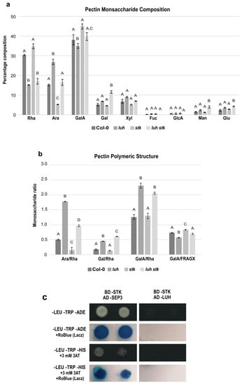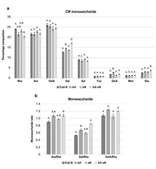 The three main components of pectins in WT were, approximately, Rha (30%), Ara (15%), and GalA (38%) (Figure 4a). luh presented high Ara and low Rha and GalA levels (Figure 4a). stk, in the opposite manner, contained low Ara and higher WT Rha and GalA levels. The luh stk behaved in the same way as WT in Ara and GalA but had lower Rha levels (similar to luh) (Figure 4a). The levels of Xyl, Fuc, and GlcA were similar in all the genotypes, while Gal, Man, and Glu were higher in luh stk compared to WT and the single mutants (Figure 4a).