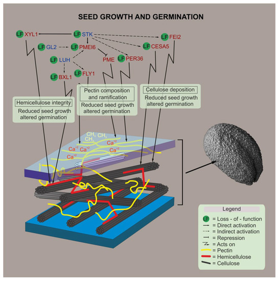 The role of CW in seed size and germination control is quite well documented [8,26,27,28]. Different transcription factors (TFs) have been shown to influence seed development via CW structural modifications. For instance, using atomic force microscopy approaches together with molecular and CW chemical analyses, the role of SEEDSTICK (STK), a MADS box TF, in seed coat biophysical properties was recently described [29]. STK controls pectin methylesterase (PME) activity and pectin maturation, thus influencing seed germination [29]. STK is a positive regulator of seed growth, since a reduction in seed size has been reported in the stk mutant [30]. Other transcriptional regulators, such as GLABRA 2 (GL2), MYB DOMAIN PROTEIN 52 (MYB52), and LEUNIG HOMOLOG (LUH), also known as MUCILAGE MODIFIED1 (MUM1), also control PME activities [31,32,33]. GL2 encodes a TF required for the proper differentiation of several epidermal cell types and regulates testa identity [34]. LUH is a major regulator of the seed coat development, and was reported to act as a transcriptional activator of genes required for mucilage extrusion MUCILAGE MODIFIED 2 (MUM2), SUBTILISIN PROTEASE1.7 (SBT1.7), and BETA-XYLOSIDASE 1 (BXL1) [10,31,35]. Recently, the role of LUH as a transcriptional repressor of Tubby-like Protein 2, which regulates HG biosynthesis in seed coat mucilage, was also proposed [36].