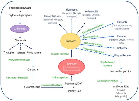 In plants, flavonoid accumulation depends upon the modulation of the expression of genes related to the flavonoid biosynthetic pathway [22,23,24]. The phenylpropanoid pathway gives p-coumaroyl-CoA. This pathway starts from the aromatic amino acids phenylalanine and tyrosine, produced by the shikimate pathway (Figure 1). The flavylium ion is known as the core of the flavonoids’ biosynthesis pathways, the upstream of which is three molecules of malonyl-CoA and one molecule of 4-coumaroyl-CoA [25]. Furthermore, CHS and CHI enzymes are involved in the two-step condensation, which yields in naringenin (flavanone) [26].