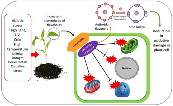 Antioxidant activities of flavonoids under abiotic stress. Following abiotic stress in plants, biosynthesis and accumulation of flavonoids takes part in reactive oxygen species (ROS) scavenging in different plant cell organelles and reduces oxidative damage in plant cells.