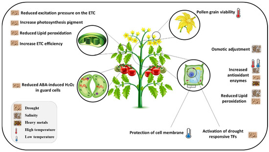 | Salinity | Zea maize | Improved plant performance under salt stress through antioxidant activities. | [60] |