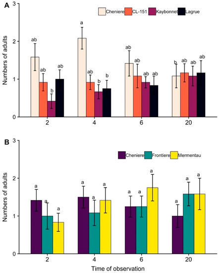 The results of the choice assay with the first group of varieties showed a significant interaction between variety and time (F9, 132 = 2.79, p = 0.005). There was a marginal difference in the mean number of adults seen on different rice varieties (F3, 44 = 2.60, p = 0.064). The mean number of adults observed on Cheniere at 4 h post-adult release (hpr) was significantly higher compared to the numbers observed on Kaybonnet and LaGrue at 4 hpr and Kaybonnet at 2 hpr (Figure 1A). Similarly, for the choice assay with the second group of varieties, the interaction between variety and time was significant (F6, 99 = 2.70, p = 0.018), but a post hoc analysis yielded no significant differences among the means (Figure 1B). Neither variety (F2, 33 = 0.10, p = 0.907) nor time (F3, 99 = 1.83, p = 0.147) had a significant effect on the preference of O. pugnax.