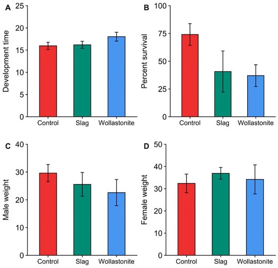Means (±SE) of (A) nymph development time (days), (B) survival to adult stage (%), and adult weights (mg) of 1 d-old (C) male and (D) female Oebalus pugnax reared on panicles taken from rice (Oryza sativa) plants treated with silicon (@ 1120 kg/ha) provided in the form of slag, wollastonite, or untreated control in the laboratory at 27 ± 1 °C and 14:10 h L:D photoperiod.
