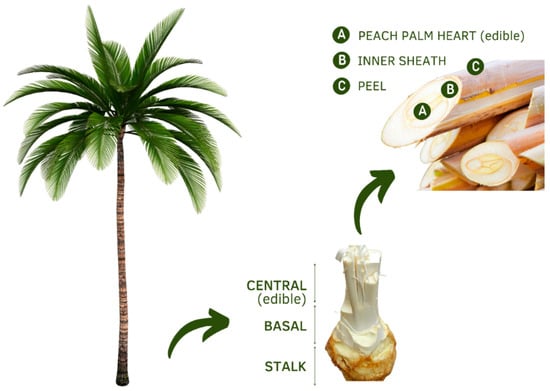 Figure 2 represents the B. gasipaes palm stalk with its parts identified. The stalk contains the palm heart, which is protected by two external wrappings and two internal ones. After harvesting, the two external wrappings are removed so that the palm heart remains protected by the two internal ones [23]. Approximately 59.6% of the total weight is represented by the hems, 14.6% by the basal part, 10.7% by the open leaves or “tip,” and only 15% of the palm heart is usable as food [8].
