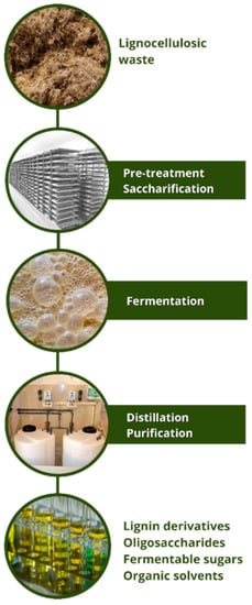 In addition to pretreatment, bioconversion of lignocellulosic materials into useful high-value products requires further steps that include hydrolysis of polymers to produce easily metabolizable molecules, such as hexose or pentose sugars, and the use of these compounds to support microbial growth, either aerobically or anaerobically (fermentative processes). Finally, the products obtained must be purified by chromatographic fractionation methods or through distillation. Considering the growing demand for energy and the environmentally harmful consequences of the use of fossil fuels, lignocellulosic biomasses are the most abundant organic materials with the potential to be used in the generation of bio-based chemicals and fuels (Figure 3) [64,73,74,75].