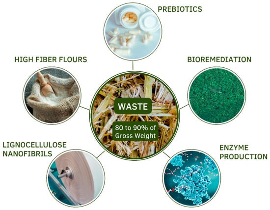 Agricultural wastes or byproducts are largely used as substrates for the cultivation of microorganisms on solid-state fermentation (SSF) for the obtainment of different products. SSF is a microbial fermentation process through which selected microorganisms (bacteria, fungi and yeasts) are cultivated on a moist, solid, non-soluble organic material that acts as a support and nutrient source for the growth of the microorganisms, in the absence or near absence of free-flowing water [90]. SSF is used for the production of rich fermented animal feed, mushrooms, and important molecules such as enzymes, organic acids, antibiotics, biofuels, and secondary metabolites [91]. Wheat bran, sugar cane bagasse, rice straw and corn cob are the most used substrate for the cultivation of microorganisms. Even so, it is worth searching for new substrates, especially if they are available in large amounts, which allow the growth of microorganisms without further supplementations and facilitate the obtainment of valuable products [92,93].
