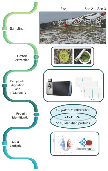 The response of C. quitensis to the different environmental cues was determined by analyzing changes in protein expression by using a comparative mass spectrometry (MS)-based proteomics approach (Figure 1). C. quitensis leaves were collected in Sites 1, 2, and 3 described above as highlighted in Figure 1, during the summer season of 2020, and the proteins were extracted by a procedure optimized to obtain a good yield [25].