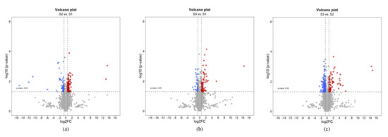 Volcano plot representation of differentially expressed proteins (DEPs) in the three data sets. Statistically significant (p-value < 0.05), |log2FC| > 0.58) upregulated and downregulated proteins for each data set are indicated with red and blue dots, respectively. Non-significant proteins are represented in gray. (a) S2 vs. S1 data set; (b) S3 vs. S1 data set; (c) S3 vs. S2 data set.