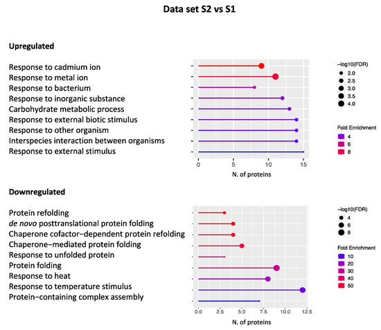 Graphical representation of the GO terms enriched in the S2 vs. S1 data set. The x-axis refers to the number of DEPs upregulated or downregulated that significantly enrich a specific GO term. Lines are colored by a red–blue gradient based on fold enrichment, whereas the size of the circle at the end of the lines is related to the statistical significance (−log10 FDR).