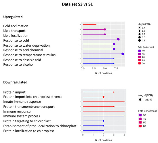 A graphical representation of the GO terms significantly enriched in the up- and downregulated protein data set S3 vs. S1, as obtained with the ShinyGO tool, is reported in Figure 4.