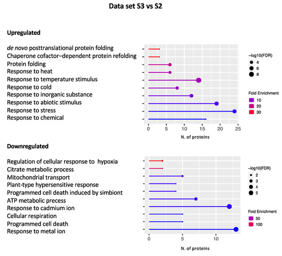 Graphical representation of the GO terms enriched in the S3 vs. S2 data set. The x-axis refers to the number of DEPs upregulated or downregulated that significantly enrich a specific GO term. Lines are colored by a red–blue gradient based on fold enrichment, whereas the size of the circle at the end of the lines is related to the statistical significance (−log10 FDR).