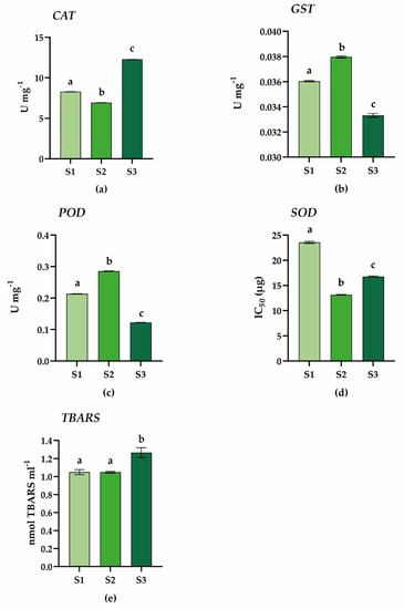 Antioxidant enzyme activities and TBARS content in C. quitensis leaves collected at the three sites S1, S2, and S3 (x-axes). (a) Catalase (CAT); (b) glutathione S-transferase (GST); (c) guaiacol peroxidase (POD); (d) superoxide dismutase (SOD); (e) TBARS content. Data represent the mean ± SD of three biological replicates. For all enzymatic assays, a statistically significant difference was found between all sites (p < 0.0001). As for TBARS, a statistically significant difference was found only between S1 vs. S3 and S2 vs. S3 (p < 0.0001). Statistic test: one-way ANOVA, Tukey’s multiple comparisons. The letters indicate significant differences between the samples.