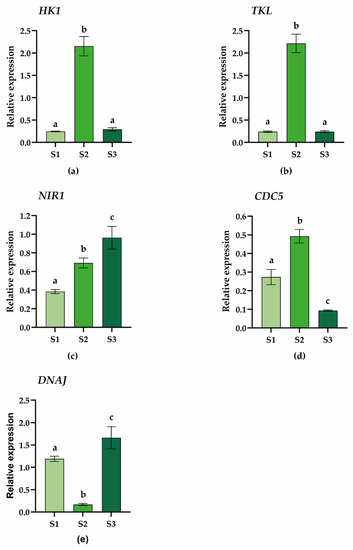 Relative expression of C. quitensis genes normalized with the reference genes elongation factor 1-alpha (EF1α). (a) Hexokinase (HK1); (b) transketolase (TKL); (c) nitrite reductase 1 (NIR1); (d) cell division cycle 5 (CDC5); (e) DNAJ. Error bars represent the mean ± SD of three biological replicates. Statistic test: one-way ANOVA, Tukey’s multiple comparisons (p < 0.05). The letters indicate significant differences between the samples.