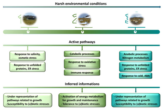In summary, our results show that Site 2 plants have a highly active energy metabolism that likely supports growth and stress tolerance. Furthermore, Site 2 appears to be the most suitable to deal with oxidative stress by activating ROS-scavenger enzymes that, in turn, limit lipid peroxidation. Furthermore, they are less prone to ER stress and protein denaturation/misfolding and appear to better counteract biotic stresses by activating the immune response. Conversely, general growth-related metabolic pathways appear to be underrepresented in Site 3 plants facing a more hostile environment. Furthermore, failing to counteract oxidative and ER stresses, these plants could be less well protected from potential stressors of both biotic and abiotic nature and, consequently, more damaged. On the other hand, plants growing in Site 1 need to face salinity and osmotic stress and, like Site 3 plants, also appear to suffer from ER stress and protein denaturation/misfolding. Nevertheless, these plants are able to activate the immune response, although, unlike plants growing in Site 2, they do not undergo intense metabolic activity.