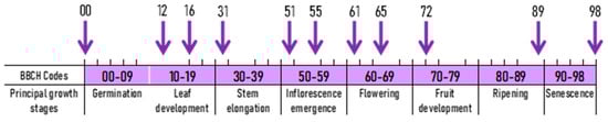 - Hack, H.; Bleiholder, H.; Buhr, L.; Meier, U.; Schnock-Fricke, U.; Weber, E.; Witzenberger, A. Einheitliche Codierung der phänologischen Entwicklungsstadien mono- und dikotyler Pflanzen-Erweiterte BBCH-Skala, Allgemein. Nachrichtenbl. Deut. Pflanzenschutzd. 1992, 44, 265–270. [Google Scholar]