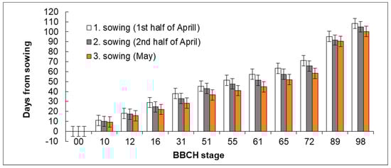 Effect of sowing date on the number of days for reaching the respective developmental stages. Mean values (n = 9) of individual variants are shown for the specific developmental stage (BBCH) in three years of study ± SD. Different letter indices are present only in variants in which significant differences were found (p < 0.05). If no letter indices are included, no significant difference was found between the respective variants.