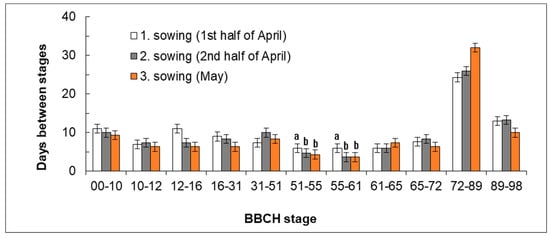 Effect of sowing date on the number of days for reaching the range of developmental stages. Mean values (n = 9) of individual variants are shown for the specific range of developmental stages (BBCH) in three years of study ± SD. Different letter indices are present only in variants in which significant differences were found (p < 0.05). If no letter indices are included, no significant difference was found between the respective variants.
