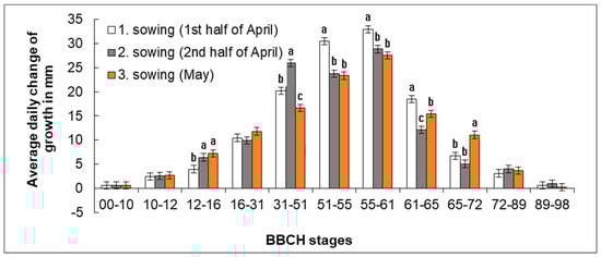 Effect of sowing date on average daily height increment reached between the respective developmental stages BBCH. Average values (n = 90) of individual variants are shown for the specific range of BBCH developmental stages in three years of study ± SD. Different letter indices are added only to variants in which significant differences were found (p < 0.05). If there are no letter indices, no significant differences were found between the individual variants.