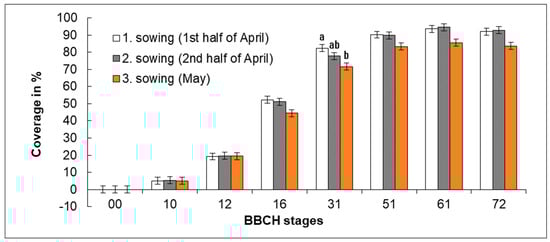 Effect of sowing date on the coverage of plants reached in individual developmental stages. Average values (n = 9) of individual variants are shown for the specific developmental stages (BBCH) in three years of study ± SD. Different letter indices are added only to variants in which significant differences were found (p < 0.05).