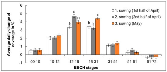 Effect of sowing date on average daily increment of coverage reached between individual BBCH developmental stages. Average values (n = 9) of individual variants are shown for the specific range of BBCH developmental stages in three years of study ± SD. Different letter indices are added only to variants in which significant differences were found (p < 0.05). If there are no letter indices, no significant differences were found between the individual variants.