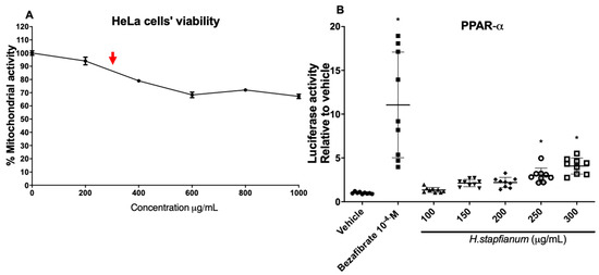 HeLa cells’ viability under treatment with ethanol extract of H. stapfianum Ravena (Amaryllidaceae) leaves (EE), and the action of the same EE on nuclear receptors PPAR\α and PPAR-γ. (A) HeLa cells were treated with different concentrations of EE (200–1000 µg/mL) for 24 h. Cell viability was measured with MTT assay and appropriate concentration under 300 µg/mL (red arrow) (B) Increasing concentrations of EE (100–300 µg/mL), vehicle (DMSO 0.1% v/v), or positive control (bezafibrate 100 μM) on PPAR-α transcriptional activity in HeLa cells, measured with luciferase gene reporter assay. (C) Increasing concentrations of EE (100–300 µg/mL), vehicle (DMSO 0.1% v/v), or positive control (rosiglitazone 10 μM) on PPAR-γ transcriptional activity in HeLa cells, measured with luciferase gene reporter assay. (D) Increasing concentrations of EE (100–300 µg/mL), vehicle (DMSO 0.1% v/v), or positive control PC (thyroid hormone T3 10 μM) on TR-β transcriptional activity in HeLa cells, measured with luciferase gene reporter assay. MTT data are means + SD of three independent experiments expressed as a percentage compared to solvent control (DMSO, 0.1% v/v). For gene reporter assay, data are reported as median + SD of three independent experiments, and the results were analyzed by Kruskal–Wallis and Dunn’s post hoc test. * represent p > 0.05.