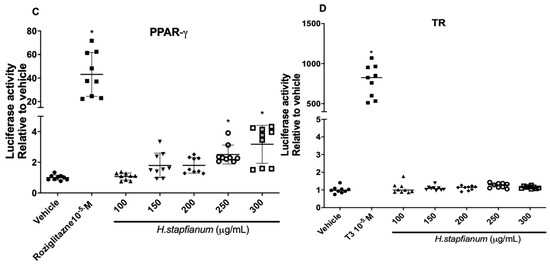 In order to verify the maximum non-toxic concentration of ethanol extract from Hippeastrum stapfianum leaves (EE), we evaluated the HeLa cells’ viability with an increasing concentration set of EE (200–1000 µg/mL) using an MTT assay, and we found an appropriate concentration under 300 µg/mL (around 90% cell viability; Figure 2A). This concentration was selected as the maximum concentration in the luciferase assay. The HeLa cells were co-transfected with plasmids containing the cDNA of GAL4-PPAR-α or GAL4-PPAR-γ or GAL4-TR to examine the EE ability to induce the PPAR-α, PPAR-γ, or TR receptor. The dose–response analysis suggested that the EE statistically improved the transcriptional activity of PPAR-α and PPAR-γ at 250 and 300 (μg/mL) compared to the vehicle (Figure 2B,C). However, compared with the positive control (rosiglitazone for PPAR-γ or bezafibrate for PPAR-α), the agonist activity was slight, suggesting partial modulation in response to these receptors. On the other hand, no activation of the TR-β receptor was detected with any of the concentrations tested of the EE (Figure 2D), suggesting a selective effect on PPAR receptors.