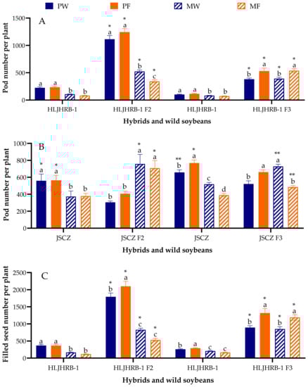 Pod number (A,B) and filled-seed number per plant (C,D) of hybrids and wild soybeans under four planting condition. Note: * and ** indicate significant difference (p < 0.05) and extremely significant difference (p < 0.01) of the same trait between hybrids and their wild soybeans. Different lowercase letters indicate significant difference (p < 0.05) of hybrids or wild soybeans among four planting conditions.