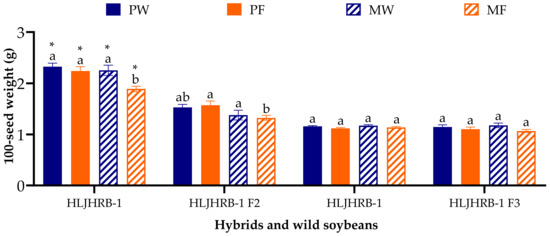 The 100-seed weight of hybrids’ seeds and wild soybean seeds under four planting conditions. Note: * and ** indicate significant difference (p < 0.05) and extremely significant difference (p < 0.01) of the same trait between hybrids and their wild soybeans. Different lowercase letters indicate significant difference (p < 0.05) of hybrids or wild soybeans among four planting conditions.