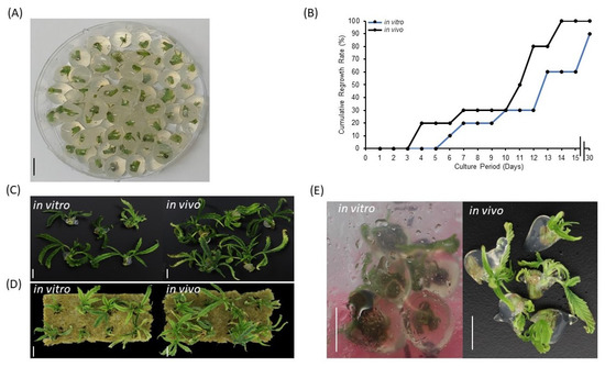 Regrowth of cannabis synseeds. Encapsulated nodal segments using calcium alginate matrix to yield 10 mm cannabis synseeds (A), regrowth rates of in vitro- and in vivo-derived synseeds on MS medium without a storage period up to 30 days culture (B), plantlets after 30 days of regrowth on MS Cannabis medium (C), and on sterile rockwool (D). Precocious germination of in vitro and in vivo-derived synseeds during the first 15 days of storage at 22 °C (E). Scale bars represent 1 cm.
