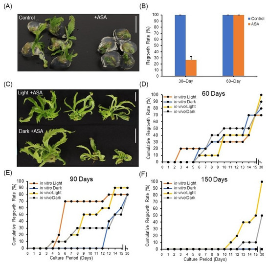 Additionally, explant source and light exposure had minimal impact on regrowth rates of ASA treated synseeds stored for 60 and 90 days (Figure 3C–E). ASA treatment of 60-day stored in vitro synseeds corresponded to a pronounced regrowth rate improvement over control from 30% to 80% and 50% to 70%, when stored in the dark or light, respectively (Figure 2B and Figure 3D). The difference in regrowth rates between ASA treated and untreated was negligible in synseeds stored for 90 days (Figure 2C and Figure 3E). ASA treatment during 150 days storage increased the regrowth rate of in vivo-derived dark stored synseeds from 0% to 50% whereas in vitro-derived light stored synseeds did not germinate (Figure 2D and Figure 3F). ASA treatment of in vivo-derived, light stored cannabis synseeds maintained viability and regrowth up to 100% after 150 days (Figure 3F).