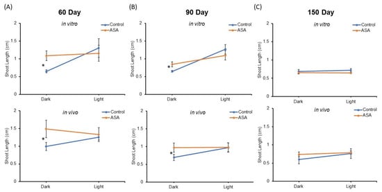 Shoot length means of encapsulated nodal segments after 15 days regrowth were compared in all treatments (Figure 4). Mean shoot length between synseeds derived from in vitro and in vivo sources were not significantly different and no significant interactor with source of synseeds was observed by ANOVA analysis. Light exposure and ASA supplementation for 60 and 90 days of storage display a significant interaction effect on shoot length after the regrowth period (p-value ≤ 0.05, Figure 4A,B).
