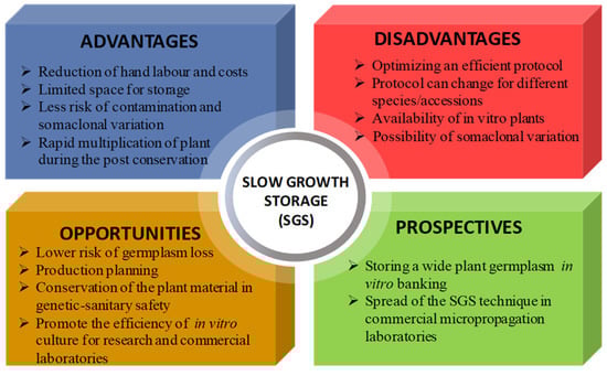 Furthermore, SGS is applied in commercial micropropagation laboratories as a suitable strategy for short- to medium-term storage of plant materials in limited space, offering the market high-quality produce of commercial cultivars at a reduced cost.